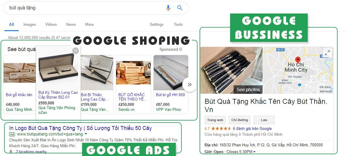 Lợi thế quảng cáo của Google Shopping Ads so với quảng cáo Google Ads cho mạng hiển thị truyền thống đó là hiển thị hình ảnh đại diện và giá được show NGAY VỊ TRÍ ĐẦU TIÊN CỦA KẾT QUẢ TÌM KIẾM