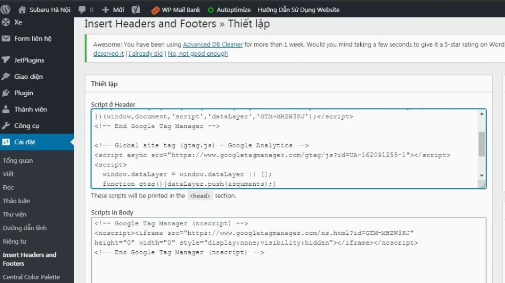 - Cài đặt plugin “Insert Header and Footer” trên website đó