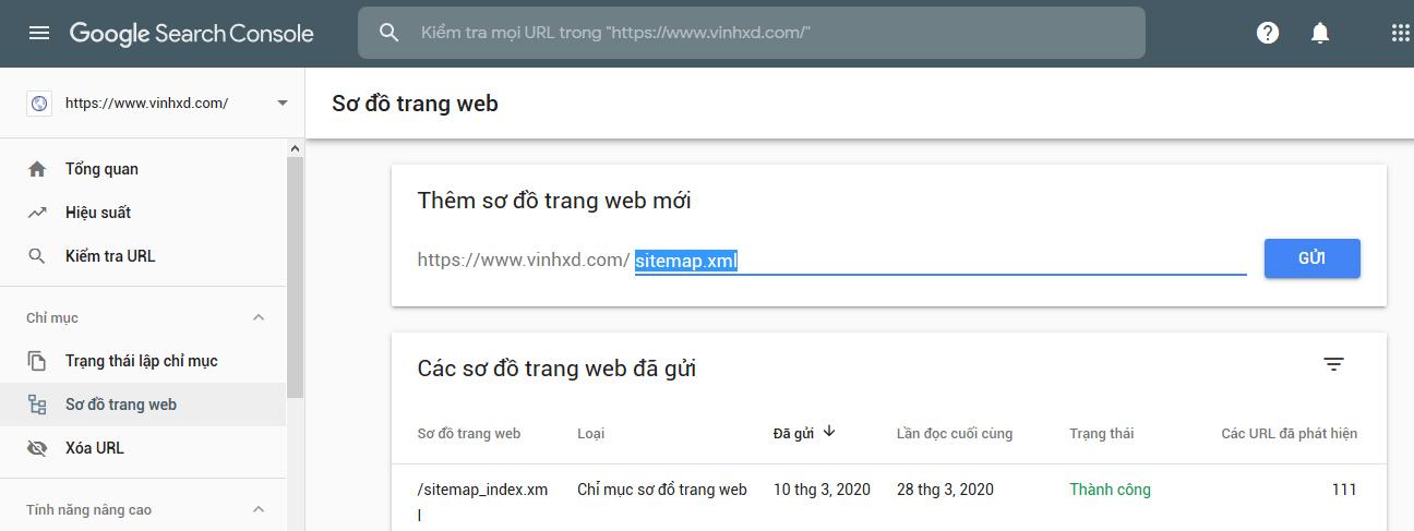 Để gửi sitemap, bạn truy cập “Sơ đồ trang web” –> Phần “thêm sơ đồ trang web mới”, bạn điền sitemap.xml, sau đó ấn gửi là hoàn tất