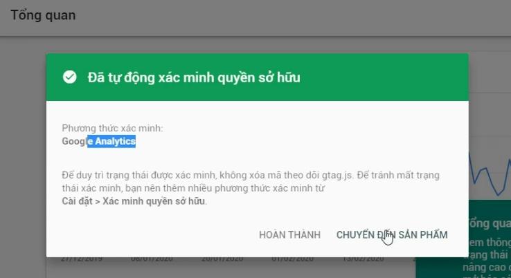 Ấn tiếp tục, Google sẽ tự xác minh quyền sở hữu website của bạn bằng Google Analytics ( nếu bạn đã làm thành công bước trên)