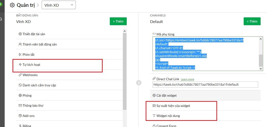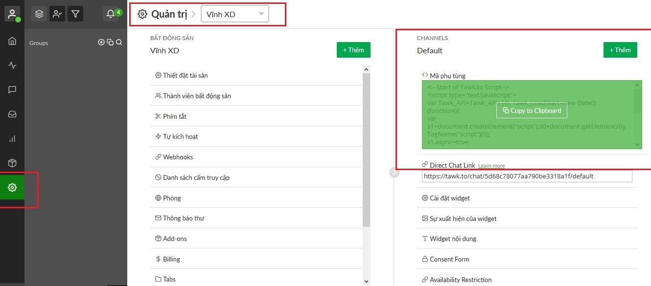 Nhúng vào website: để cài tawk.to lên website của bạn, tại giao diện quản trị của tawk.to bạn vào Admin( hình bánh xe), có đoạn code, copy nó.
