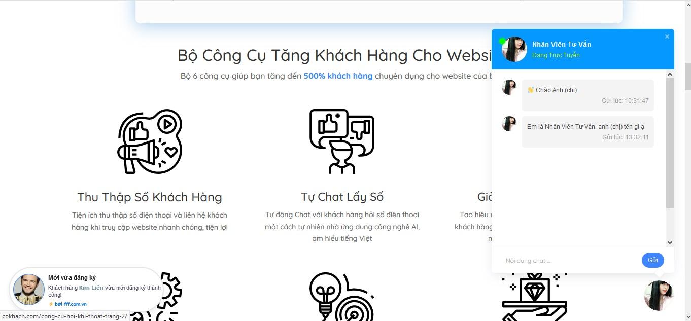 Nếu uhchat là xấu xí và ổn ào, thì với mình cokhach.com là công cụ trẻ trâu, màu mè đến khó chấp nhận, avatar của có khách thường là ành các bạn nữ selfie chắc chưa học song…trung học 😅😅 , bot trên cokhach cũng kiểu target vào các anh trai thì phải… vậy nên nếu nhóm khách hàng chính của bạn là …trai, bạn có thể cân nhắc về công cụ này.