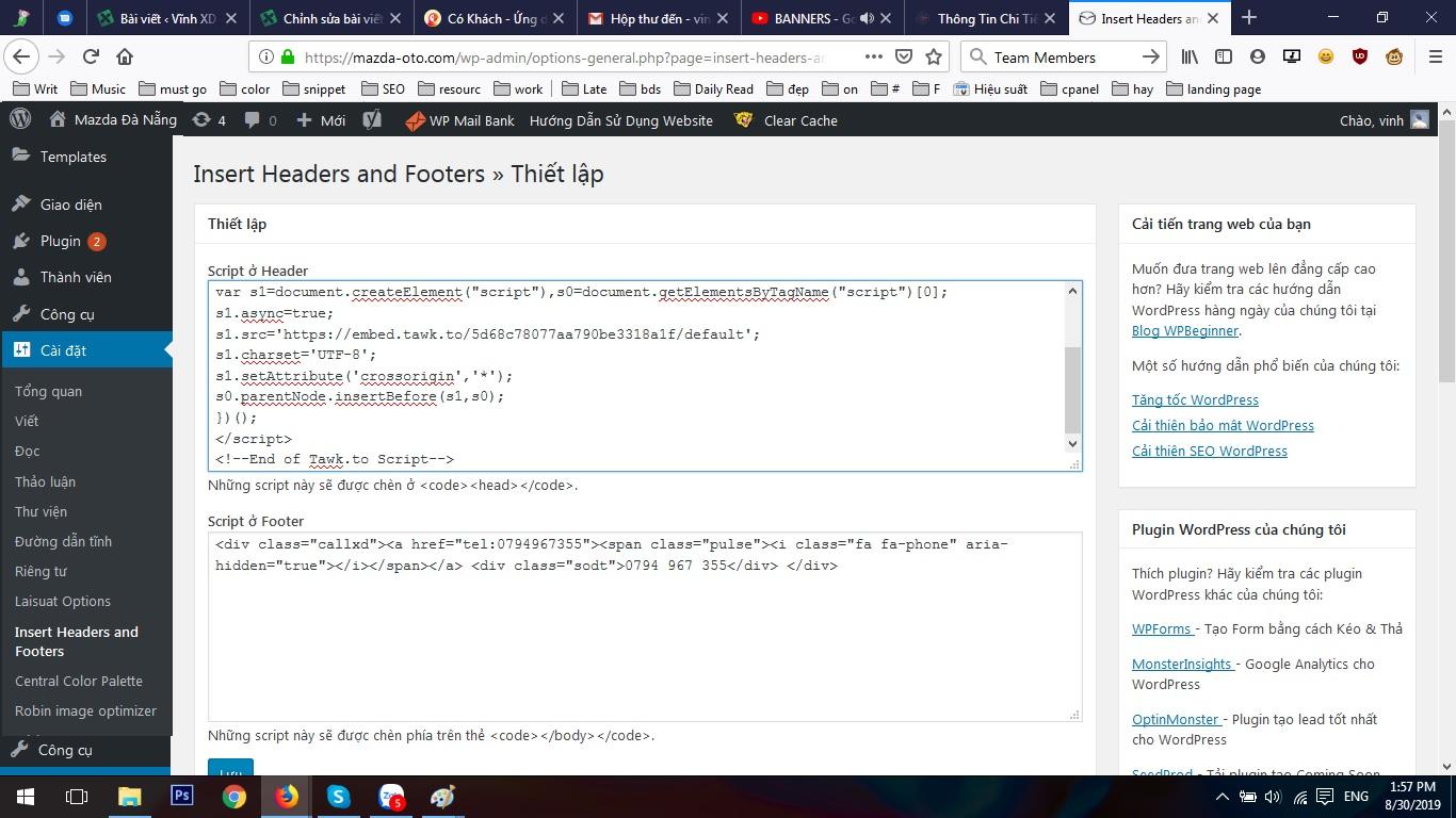 Các công cụ live chat thường có mã nhúng vào website, đoạn mã này bạn sẽ nhận được sau khi đăng ký dịch vụ thành công. Để cài đặt đoạn mã này vào website, đơn giản bạn chỉ cần vào quản trị website —> cài đặt—> Insert header and Footer –> dán đoạn mã vào header rồi lưu lại là được.