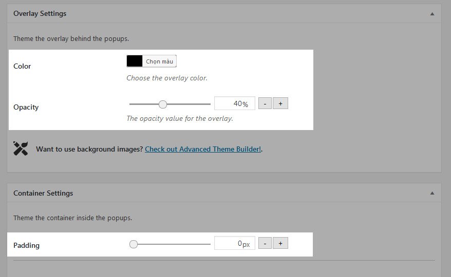 Tại giao diện quản trị wordpress, bạn vào “Popup Maker” –> “Popup Themes”, Tìm “Default Theme” rồi chọn chỉnh sửa, bạn chú ý chọn những thông số sau: