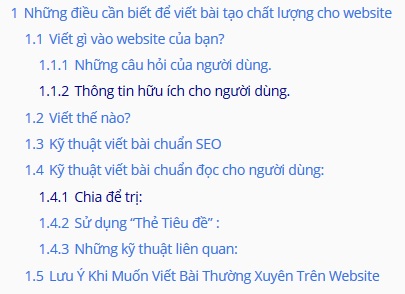Ví dụ: –Viết gì? -Viết thế nào? -Kỹ thuật viết? -Lưu ý, tôi sử dụng “tiêu đề 3”- để xác định đây là sườn chính của website, – Tổng hợp và -Dịch tôi dùng “tiêu đề 4” – để xác định đây là đoạn văn làm rõ cho ý chính trong “tiêu đề 3”.