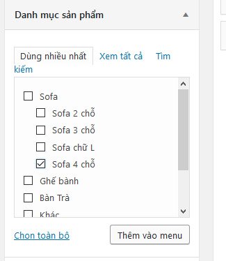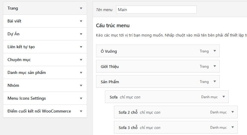 Ví dụ tôi muốn thêm một danh mục sản phẩm “sofa 4 chỗ ” vào menu, tôi sẽ tạo 1 danh mục “sofa 4 chỗ”, sau đó kéo vào menu