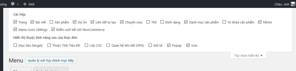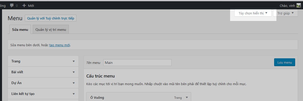 Bạn sẽ vào vùng làm việc gồm 2 cột, một là cấu trúc của menu trên website, một là những tùy chọn để thêm nhanh nội dung vào menu của bạn