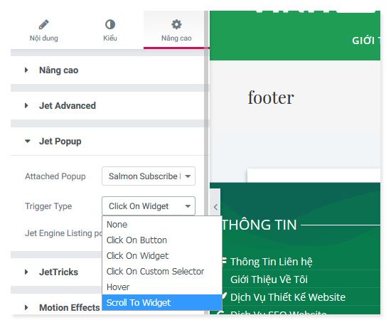 Để cài đặt Scroll Trigger , đơn giản bạn chỉ 1 trong những element cuối trang–> nâng cao–> jet popup: